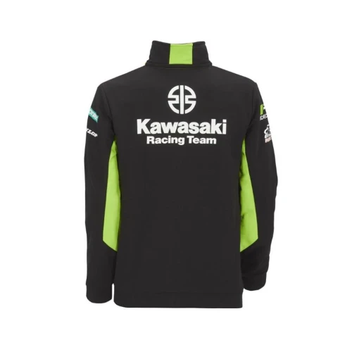 Genser med glidelås i Kawasaki-grønn og svart. Glidelås på ytre lommer, stående krage og ribbestrikket kant og mansjetter.