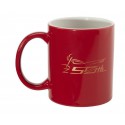 Rødt porselenskrus trykket med 50-års jubileumslogo i gull.